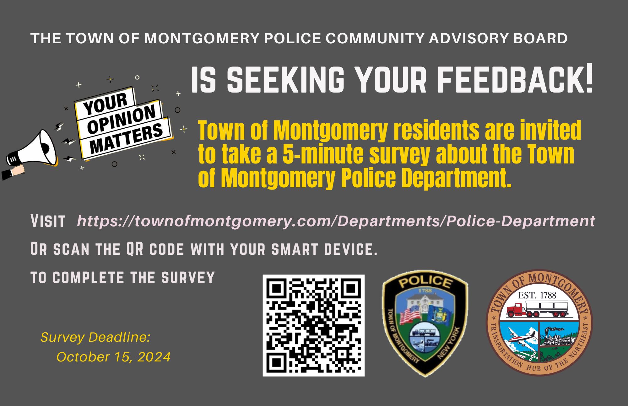 The mission of the Town of Montgomery Police Community Advisory Board is to promote community trust in the Town of Montgomery Police Department and to enable the Police Department to fulfill its public safety goals as effectively as possible. The Board will work to open lines of communication between community members and police, advance transparency and accountability of Police Department operations, and advise the police department on policies, procedures and programs.